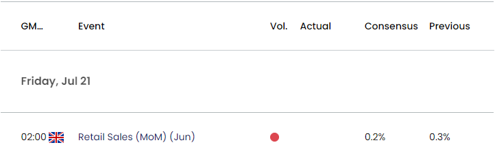继前一个月增长0.3%之后,预计英国6月零售销售将增长0.2%。6月会议上产生了72的投票分歧,需求放缓的迹象可能会导致英国央行内部出现更大的异议。