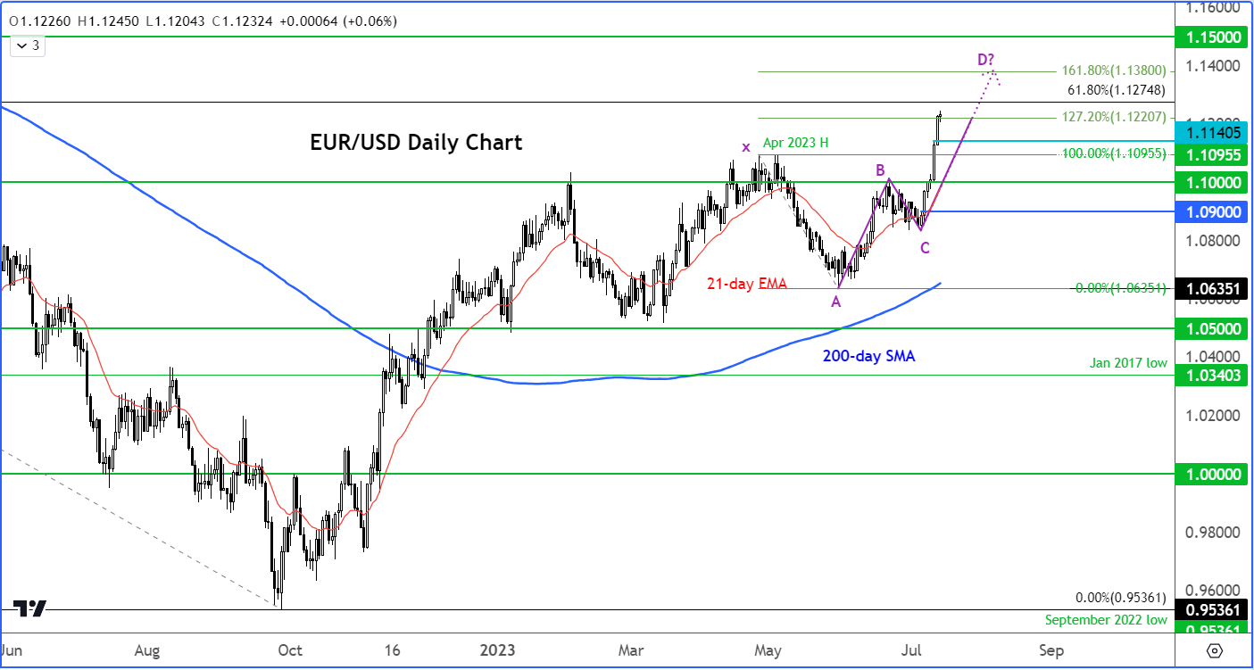值得关注的是一个基于斐波那契数列的价格走势正在形成,即谐波蝶形——见图表上的注释。随着价格点X、ABC已经确定,关键问题是“D”将出现在哪里。这通常是价格遇阻转跌的地方。斐波那契扩展点位可以作为参考。BC段的127.2%延伸位于1.1220。但与AB段相比,CD段的移动速度更快,我预计CD段会比AB段长。因此,继续向161.8%斐波那契延伸位1.1380是我认为欧元/美元可能形成至少是临时顶部的地方。