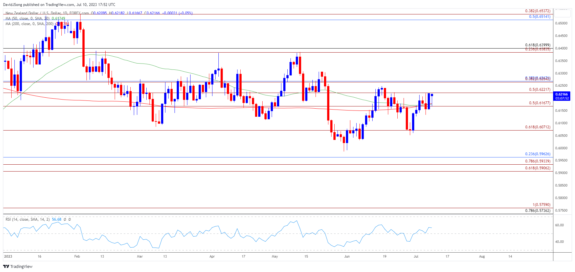 随着纽元/美元在6月区间内盘整,本月初以来的涨势看来已经停滞,在50日(0.6175)和200日(0.6178)均线的平缓斜率下,汇率可能会继续横盘整理。